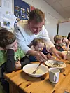 Barna øser opp selv, får hjelp, eller hjelper sidemannen.